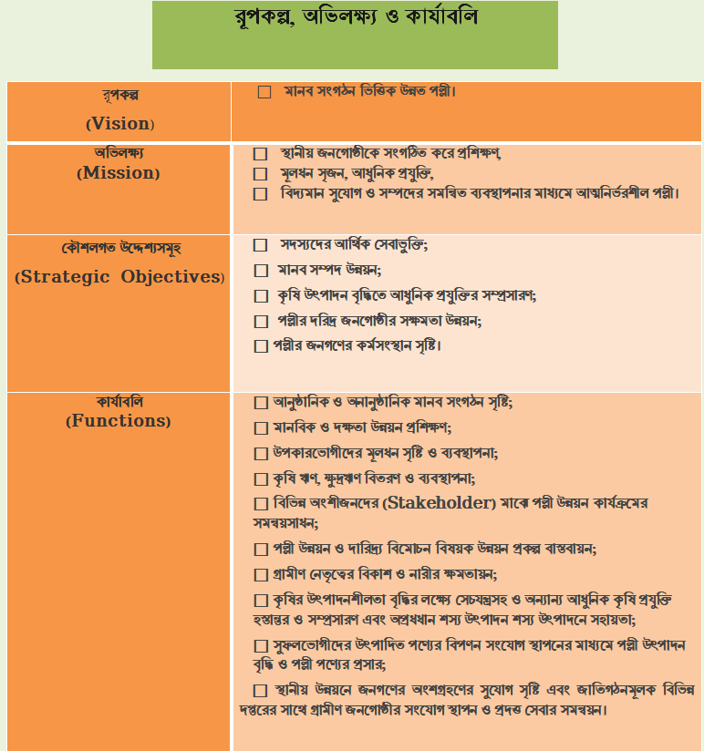 | কৌশলগত উদ্দেশ্যসমূহ (Strategic Objectives) | ≥ সদস্যদের আর্থিক সেবাভুক্তি; ≥ মানব সম্পদ উন্নয়ন; ≥ কৃষি উৎপাদন বৃদ্ধিতে আধুনিক প্রযুক্তির সম্প্রসারণ; ≥ পল্লীর দরিদ্র জনগোষ্ঠীর সক্ষমতা উন্নয়ন; ≥ পল্লীর জনগণের কর্মসংস্থান সৃষ্টি।